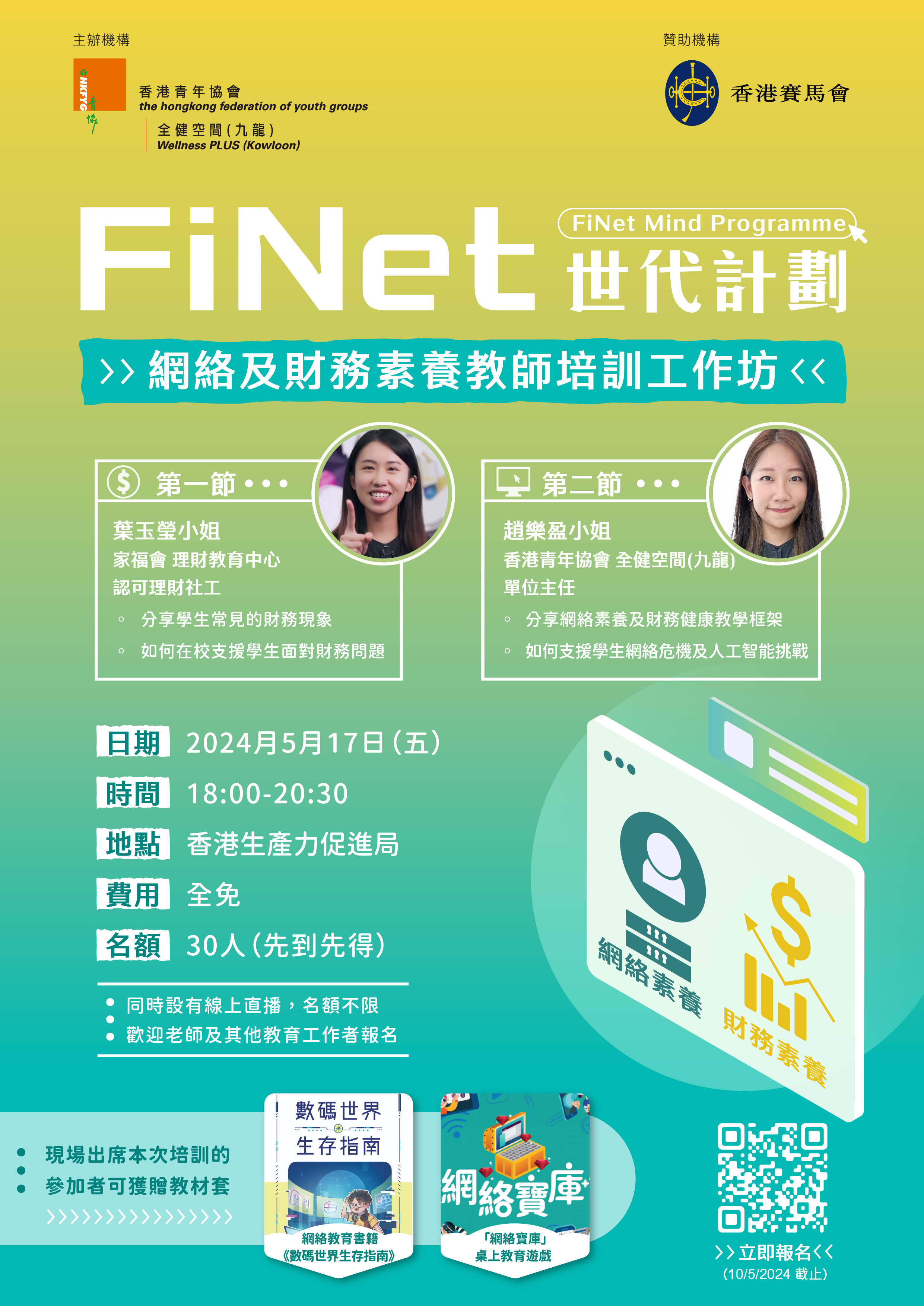 「FiNet 世代計劃」 網絡及財務素養教師培訓工作坊香港青年協會「全健空間」(九龍)一直致力推動推動青年的「全人健康發展」,重點關注學生的數碼健康及財務健康。承蒙香港賽馬會贊助,「FiNet 世代計劃」目的培養學生「未來技能」的發展,鞏固他們網絡素養及建構正確的理財觀念,並協助學生善用網絡資源及規劃未來。為提升學生及教師對網絡素養及理財教育的認識及關注,現邀請中小學教師及相關教育工作者參與5月的「網絡及財務素養教師培訓工作坊」,分享青少年使用網絡習慣及潛在風險,探討在校提供預防及支援服務方針,協助教師在校推動網絡素養及理財教育。線上線下同步舉行。詳情如下: |