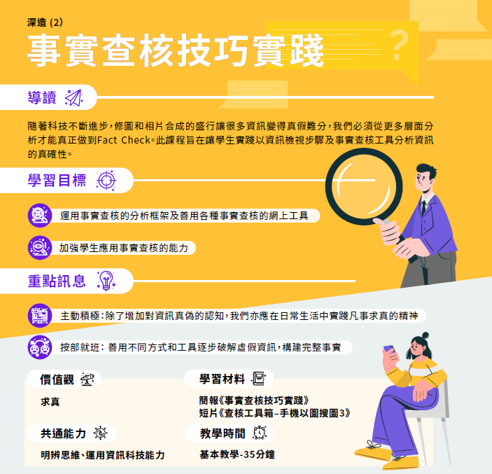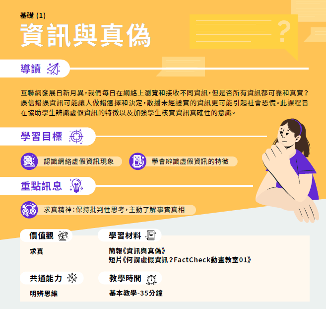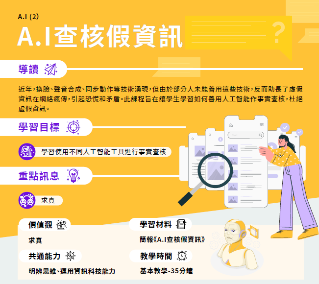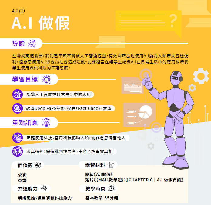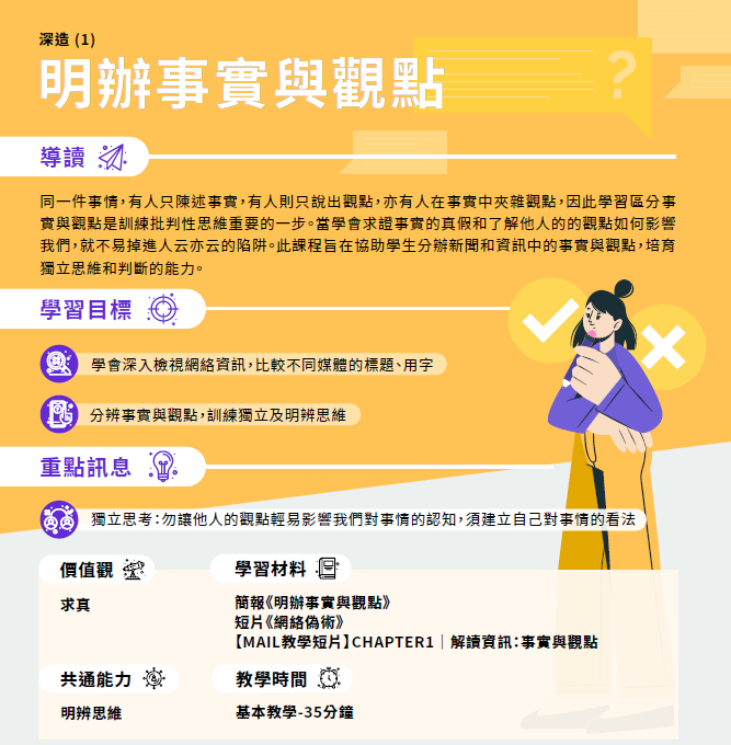 Project MAIL 教材套 – 資訊與真偽 承蒙優質教育基金贊助,香港青年協會於2021-2023年推行為期三年的Project MAIL,為全港35間中學提供媒體及人工智能素養課程。 為支援本港學校繼續培育青少年的數碼能力及未來技能,並配合日新月異的科技發展,我們編撰了最新中學教材資源套,為教師提供緊貼時代步伐、內容全面的教學素材。 資訊與真偽 欺凌與安全 創作與權益 網絡溝通及公民參與