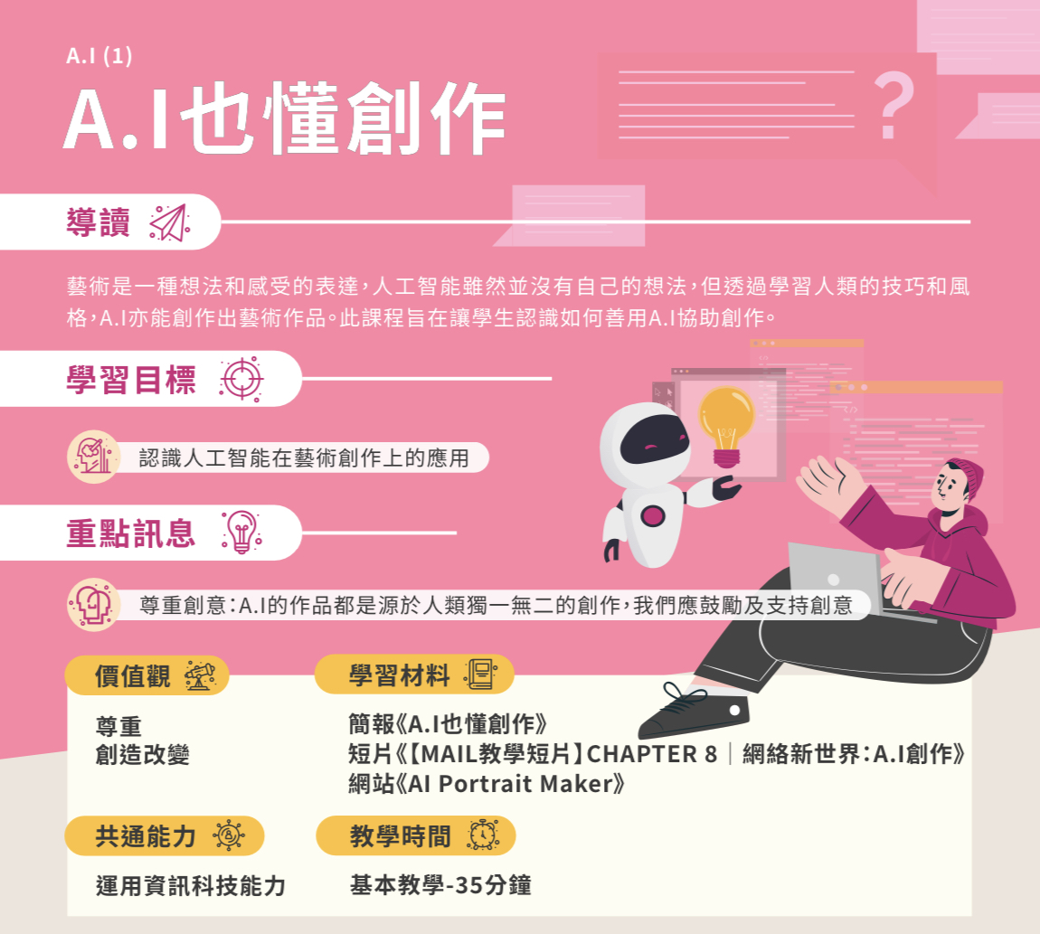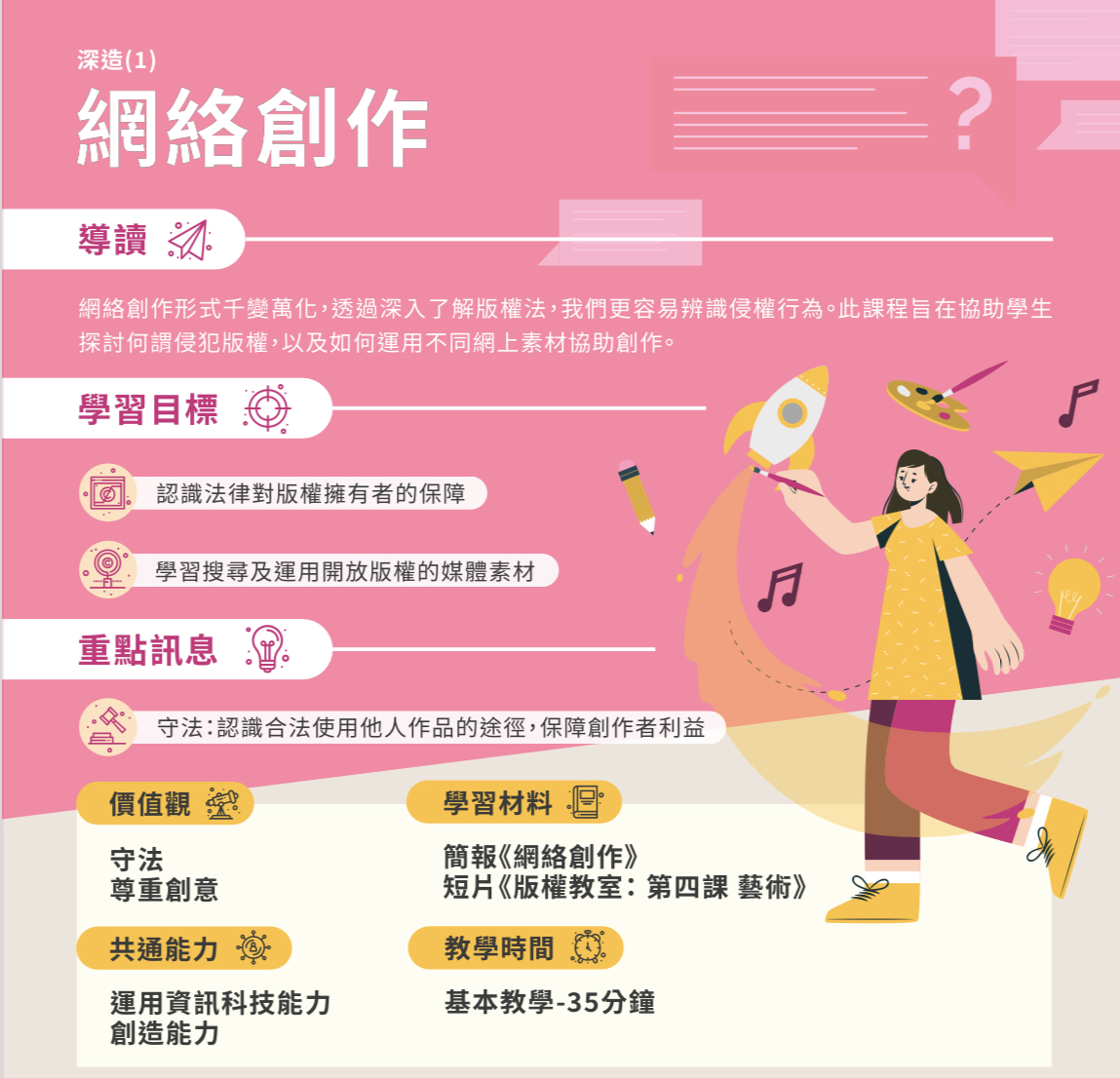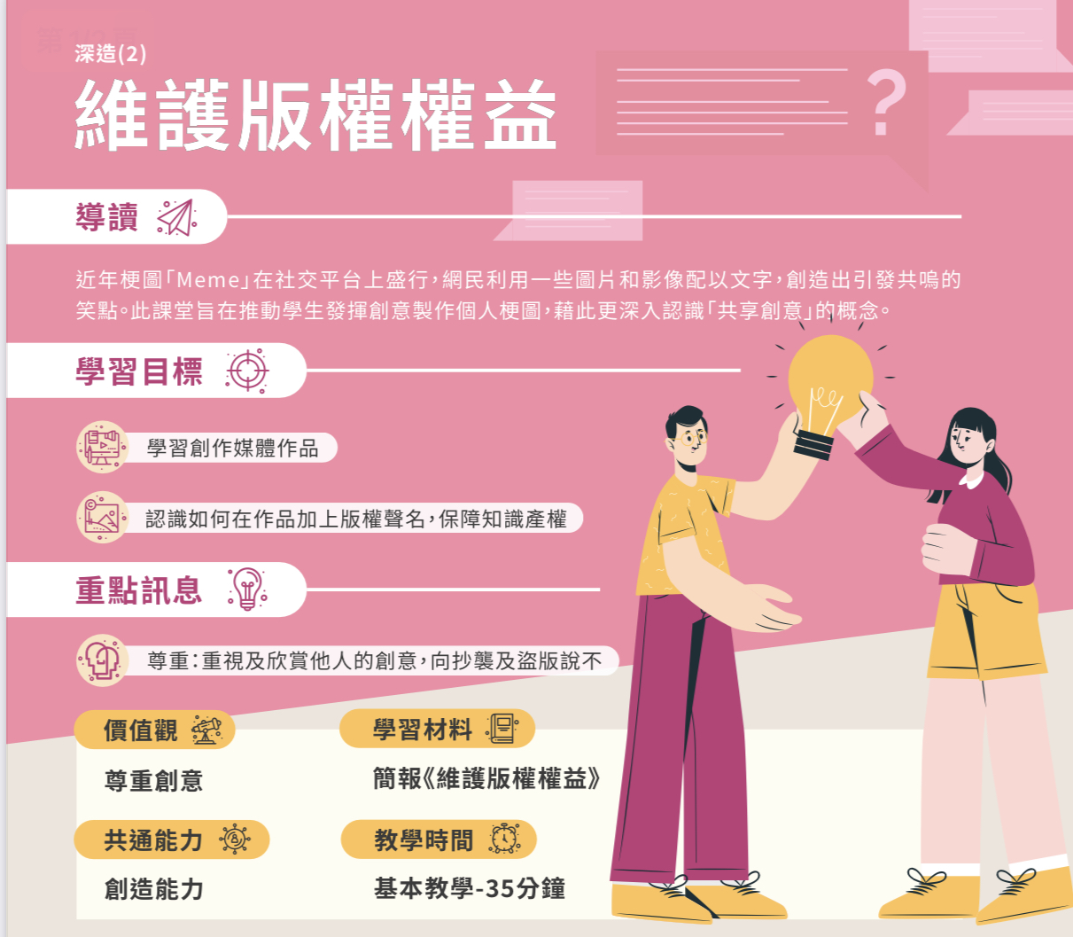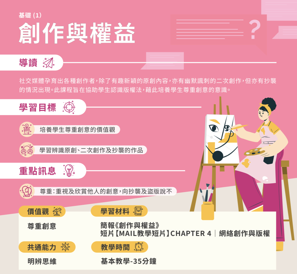 Project MAIL 教材套 – 創作與權益 承蒙優質教育基金贊助,香港青年協會於2021-2023年推行為期三年的Project MAIL,為全港35間中學提供媒體及人工智能素養課程。 為支援本港學校繼續培育青少年的數碼能力及未來技能,並配合日新月異的科技發展,我們編撰了最新中學教材資源套,為教師提供緊貼時代步伐、內容全面的教學素材。 資訊與真偽 欺凌與安全 創作與權益 網絡溝通及公民參與