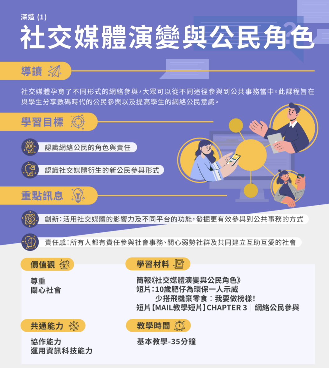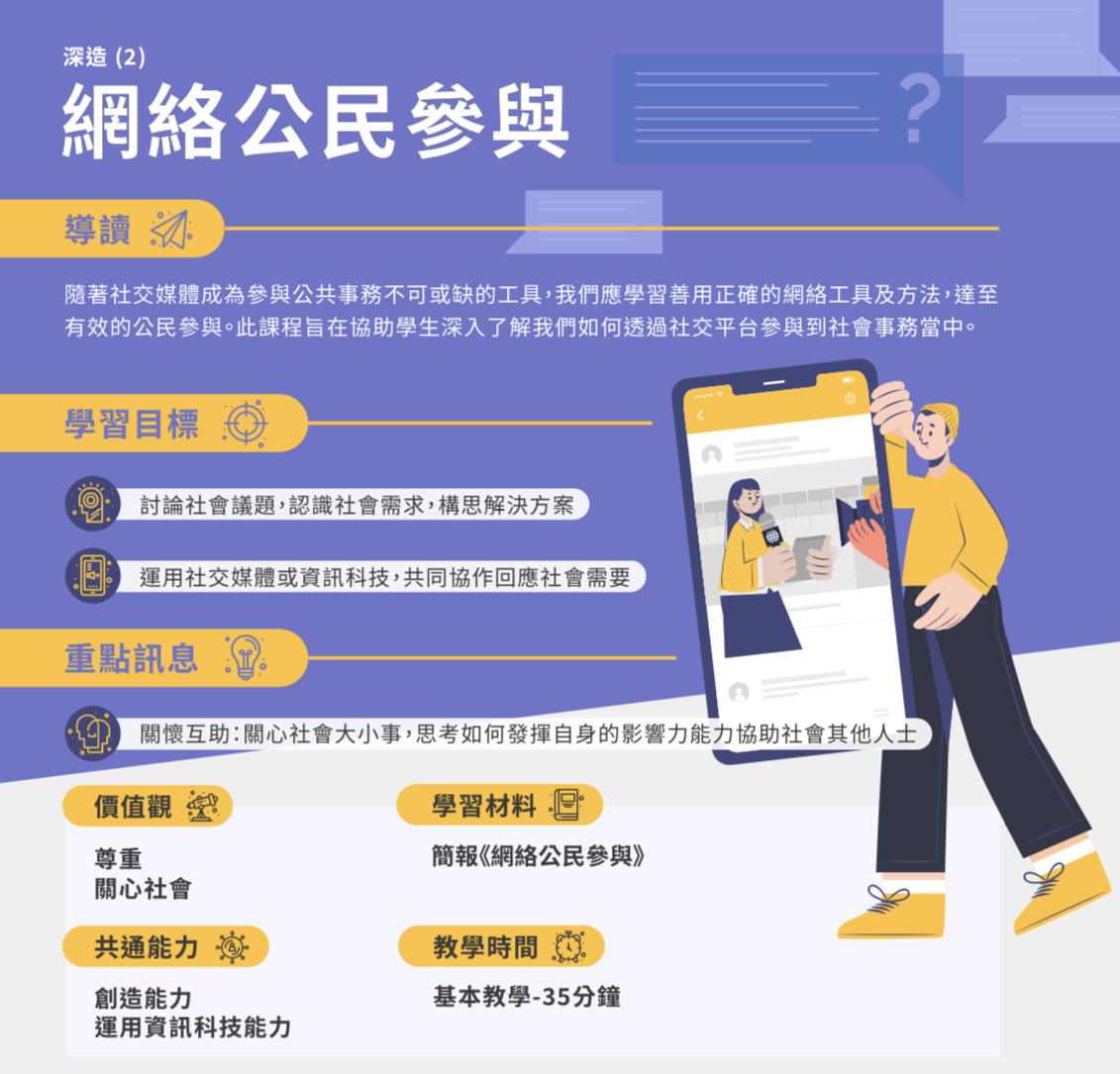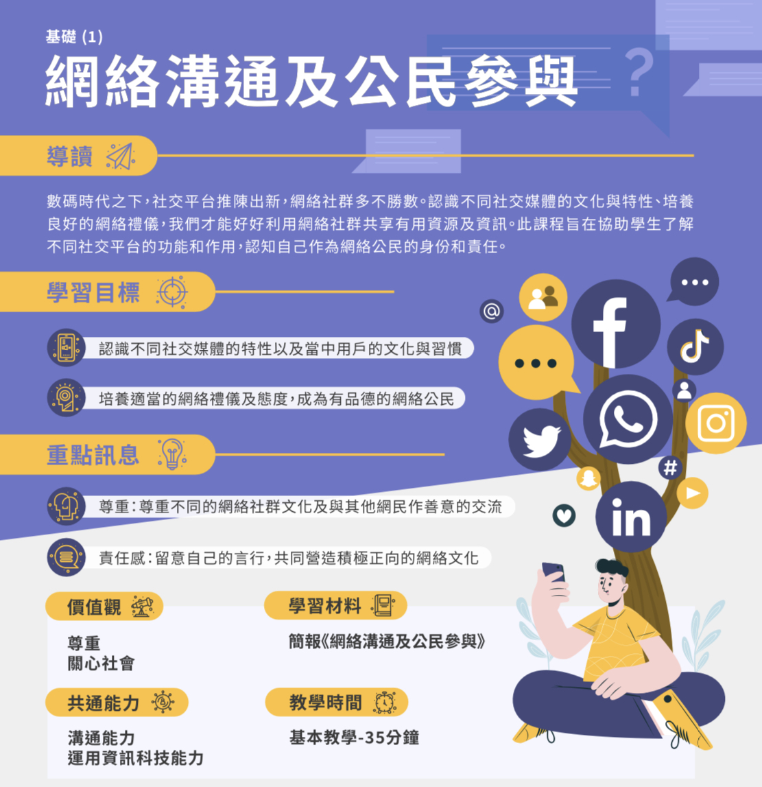 Project MAIL教材套 – 網絡溝通及公民參與 承蒙優質教育基金贊助,香港青年協會於2021-2023年推行為期三年的Project MAIL,為全港35間中學提供媒體 及人工智能素養課程。 為支援本港學校繼續培育青少年的 數碼能力及未來技能,並配合日新月異的科技發展,我們 編撰了最新中學教材資源套,為教師提供緊貼時代步伐、 內容全面的教學素材。 資訊與真偽 欺凌與安全 創作與權益 網絡溝通及公民參與